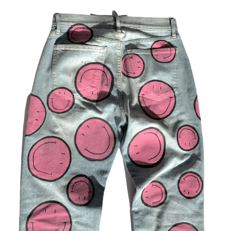 Bring joy to your style with the Pink Smiley Jeans, a bold and playful addition to your wardrobe. These new custom-painted jeans feature vibrant pink smiley designs that exude positivity and creativity. Designed as a unisex fit, they’re perfect for anyone looking to stand out with unique, artistic flair.